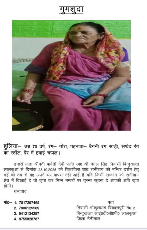 अजय अनेजा 👉 ब्यूरो चीफ 👉 लालकुआं 👉 बिंदुखत्ता 👉 लालकुआं। गत 28 अक्टूबर को रानीबाग स्थित चित्रशिला घाट में मंदिर में दर्शन के लिए गई पार्वती देवी के एक सप्ताह बाद तक घर नहीं पहुंचने के चलते परिजनों की चिंताएं बढ़ गई है, वहीं उन्होंने मामले की गुमशुदगी दर्ज कराते हुए पुलिस प्रशासन से उनकी खोजबीन करने की गुहार लगाई है।