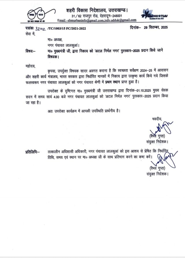 लालकुआं नगर पंचायत का अटल निर्मल पुरस्कार 2025 लिए चयन