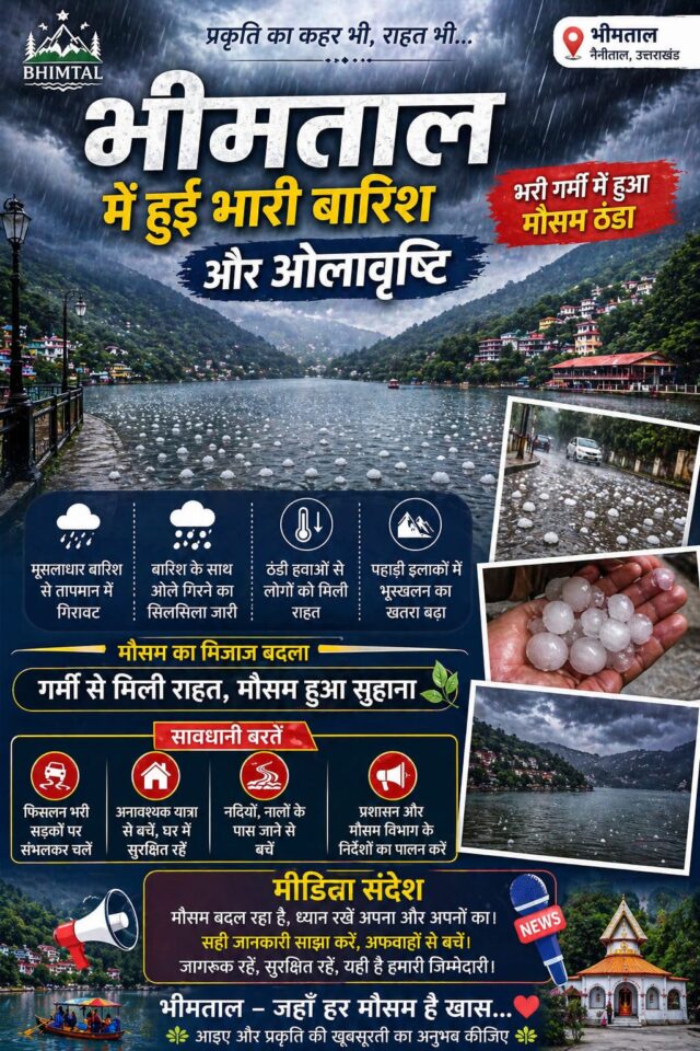 भीमताल में मौसम ने अचानक करवट लेते हुए तेज बारिश के साथ ओलावृष्टि शुरू हो गई है। कड़ाके की गर्मी के बीच आई इस बारिश और ओलों ने मौसम को पूरी तरह ठंडा और सुहावना बना दिया है।